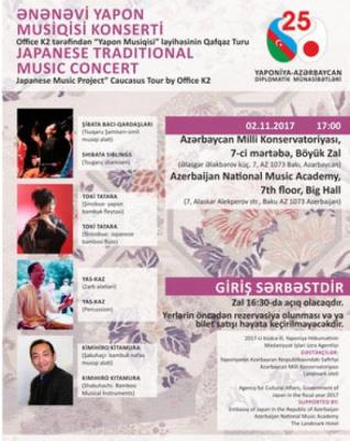 Yaponiyanın Azərbaycandakı səfirliyinin dəstəyi ilə reallaşacaq konsertdə Şamisen (simli musiqi aləti), yapon bambuk fleytası (şinobue və şakuhaçi) və zərb alətlərində ifalar səslənəcək, gündoğan ölkənin professional ifaçıları çıxış edəcəklər.