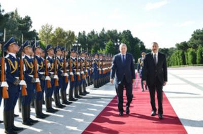Hər iki ölkənin dövlət bayraqlarının dalğalandığı meydanda ali qonağın şərəfinə fəxri qarovul dəstəsi düzülüb.