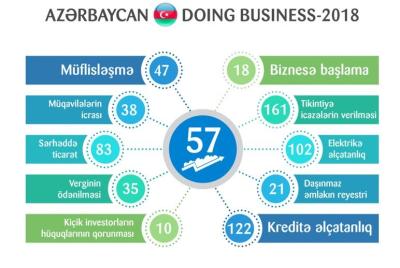 «Особо хочу отметить, что в улучшение показателей по шести пунктам важную роль сыграл ряд экономических реформ, проведенных под руководством главы государства. Во-первых, это свыше 200 поправок в налоговое законодательство, которые были внесены в конце 2016 года. Фактически это послужило улучшению показателей страны по пункту «оплата налогов» на пять ступеней. В то же время можно отметить работы по улучшению доступа к кредитам, среди которых создание частного кредитного бюро, принятие закона «Об обременении движимого имущества» и другие», - сказал Гасымлы.
