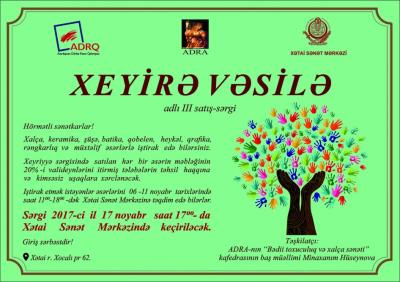 Noyabrın 17-də Azərbaycan Dövlət Rəsm Qalereyası, Azərbaycan Dövlət Rəssamlıq Akademiyası və Xətai Sənət Mərkəzinin birgə dəstəyi ilə “Xeyrə vəsilə” adlı III xeyriyyə satış- sərgisi təşkil olunacaq. Rəssamlıq Akademiyasında keçiriləcək xeyriyyə satış -sərgisində bu təhsil ocağının müəllim və tələbələrinin əsərləri təqdim ediləcək.