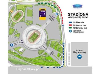 Stadion rəhbərliyi azarkeşlərdən xahiş edir ki, stadiona gələrkən E qapısında yerləşən Şərq körpüsündən və S qapısında yerləşən Cənub körpüsündən, çıxış zamanı isə Bakı Nəqliyyat Agentliyi tərəfindən təqdim olunan avtobuslara və İctimai Dayanacağa getmək üçün N qapısında yerləşən Şimal körpüsündən və "Koroğlu" m/s üçün isə S qapısında yerləşən Cənub körpüsündən istifadə etmək lazımdır.