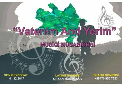 Azərbaycan Respublikası Prezidenti yanında Gənclər Fondunun maliyyə, YAP Gənclər Birliyinin və Azərbaycan Dövlət Mədəniyyət və İncəsənət Universitetinin təşkilati dəstəyi ilə “Vətənim - and yerim” adlı musiqi müsabiqəsi keçirilir.