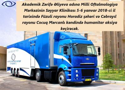 Akademik Zərifə Əliyeva adına Milli Oftalmologiya Mərkəzinin Səyyar Klinikası yanvarın 5 və 6-da Füzuli rayonu Horadiz şəhəri və Cəbrayıl rayonu Cocuq Mərcanlı kəndində humanitar aksiya keçirəcək.