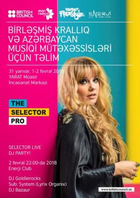 “YARAT” Müasir İncəsənət Mərkəzində fevralın 2-dək davam edəcək tədbir “Selector PRO” layihəsi çərçivəsində reallaşacaq. Təlimdə Böyük Britaniya və Azərbaycandan olan aparıcı musiqi xadimləri – nəzəriyyəçi və praktiklər bir araya gələcək. Üç gün davam edən ustad dərsləri silsiləsində tədbirlərin təşkili, o cümlədən, tədbirlərin planlaşdırılması və konsepsiyasının hazırlanması, auditoriyanın seçilməsi, marketinq, reklam və təşviqat, canlı ifaların təşkili, layihələrin idarə edilməsi, sağlamlıq və əmək təhlükəsizliyi, qanunvericilik və texnologiya kimi məsələlərin bütün aspektlərinə peşəkar nöqteyi-nəzərdən yanaşılacaq. İntensiv təlim kursunu britaniyalı event-prodüser və təlimatçı Dan Tsu aparacaq. Eyni zamanda, fevralın 2-si, saat 22:00-da “Enerji” klubunda tanınmış britaniyalı və azərbaycanlı DJ-lərin iştirakı ilə “Selector” əyləncə gecəsini təşkil edəcək.