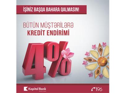 Bankdan verilən məlumata görə, aksiya çərçivəsində Kapital Bank-dan kredit götürən hər kəsə illik faiz dərəcəsində 4% endirim edilir. 8 000 AZN-dək olan kreditlər isə zaminsiz verilə bilər. Aksiya 31 mart 2018-ci il tarixədək keçirilir.
