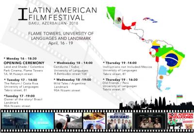Meksikanın Azərbaycandakı səfirliyinin təşkilati dəstəyi ilə aprelin 16-dan 19-dək Bakıda ilk Latın Amerikası Kinofestivalı keçiriləcək.