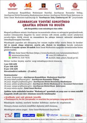 Mədəniyyət Nazirliyi, Azərbaycan Rəssamlar İttifaqı, Azərbaycan Dövlət Rəssamlıq Akademiyasının dəstəyi, Azərbaycan Dövlət Rəsm Qalereyası və Xətai Sənət Mərkəzinin təşkilatçılığı ilə “Azərbaycan təsviri sənətində qrafika dünən və bu gün” adlı respublika rəsm müsabiqəsi elan edilib.
