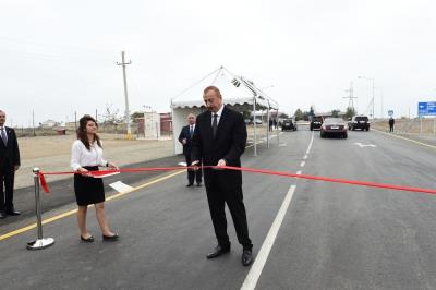 Prezident İlham Əliyev yolun rəmzi açılışını bildirən lenti kəsib.