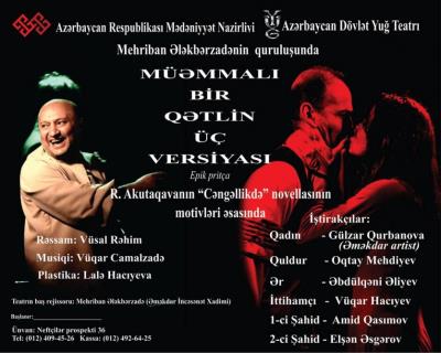 Əməkdar incəsənət xadimi Mehriban Ələkbərzadənin hazırladığı Dövlət “YUĞ” Teatrının repertuarında xüsusi yer tutan “Müəmmalı bir qətlin üç versiyası” tamaşası Tatarıstan Respublikasının paytaxtı Kazan şəhərində keçiriləcək, “Nauruz” beynəlxalq teatr festivalına dəvət alıb.