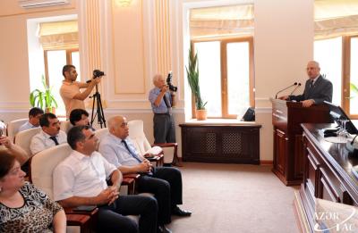 Tədbiri giriş sözü ilə açan Tarix İnstitutunun direktoru, akademik Yaqub Mahmudov “Azərbaycan” qəzetinin Azərbaycan Xalq Cümhuriyyətinin yaşıdı olduğunu diqqətə çatdırıb. Vurğulayıb ki, Cümhuriyyət tarixinin öyrənilməsində “Azərbaycan” qəzetində dərc olunmuş materialların ilk mənbə kimi əhəmiyyəti böyükdür. Qəzetin ilk nömrəsi 1918-ci il sentyabrın 15-də Gəncə qubernatorunun mətbəəsində çap edilib. Qəzetin Gəncədə Azərbaycan dilində buraxılmış səhifələrinin başında qəzetin adı ilə yanaşı “Türk və islamçılığa aid məqalələrə “Azərbaycan”ın səhifələri açıqdır” yazısı da verilib.