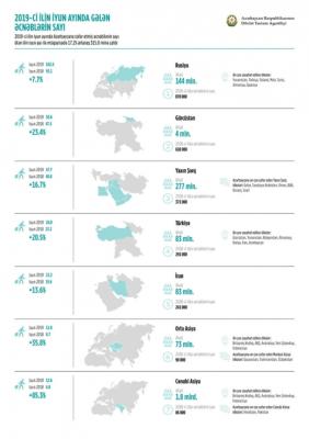 2019-cu ilin iyun ayında gələnlərin sayında əhəmiyyətli dərəcədə artım müşahidə olunub – bu artım 17.2 faiz təşkil edib. Bu tendensiya özünü Azərbaycan turizmi üçün xarakterik olan bütün ölkələr üzrə göstərib.