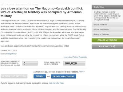 Ağ Evin rəsmi saytında Dağlıq Qarabağ münaqişəsinin və Azərbaycan torpaqlarının 20 faizinin işğalına diqqət yönəltmək məqsədi ilə yerləşdirilən petisiyada səslərin sayı 100 minə çatıb.