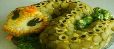 Qarışığı geniş bir qaba ilan formasında yayılır, xırdalanmış yumurta ustən səpilir, nazik doğranmış xiyar turşusu səliqə ilə üstən düzülür, gözlərə bölünmüş qara zeytun qoyulur, kökdən tac kəsilir, üz hissəyə qarğıdalı düzülür. Yumurtadan artıq qalanını sarımsaqla, pendirlə, mayonezlə köyərti ilə qarışdırıb ilan yumurtasına bənzədilir və ilanın yanına düzülür.