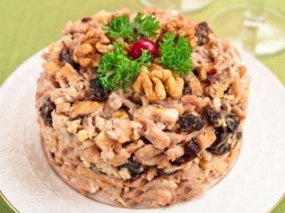 Blinçik, toyuq əti, qara gavalı və qozu qarışdırın. Azca duz vurun.