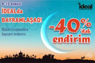Bayram münasibəti ilə “İdeal-da Bayramlaşaq” deyib, 8-12 avqust tarixlərində 40% -dək endirim aksiyasını elan edir! Bayram hədiyyələrinizi 40%-dək endirimlə əldə edib doğmalarınızı sevindirməyə tələsin.