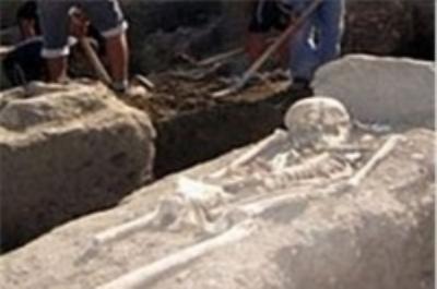 Arxeoloqlar açdıqları bir qəbirdən sol tərəfdən sinəsinə kotan dişi saplanmış kişi skeleti tapıblar.