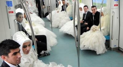 Türkiyənin İstanbul şəhərində 48 bəy və gəlin cütlüyü metroya enərək insanların marağına səbəb olublar. Publika.az xəbər verir ki, hər il təşkil edilən " Sərnişin Toy Mərasimi" bu il də rəngli görüntülərə səhnə olub. Maddi imkansızlıqlar üzündən evlənə biləyən cütlüklər İstanbulun Mərmərə Kazlışeşmə stansiyasına enərək toplu toy mərasimi təşkil ediblər. Onlar buradan qatara minərək iki dəniz altından keçməyin həyəcanını yaşayıblar.
