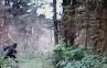 New video footage of someone driving down a road in the woods stumbles upon a giant hairy creature crossing the road. The person filming stops the vehicle and turns around.
