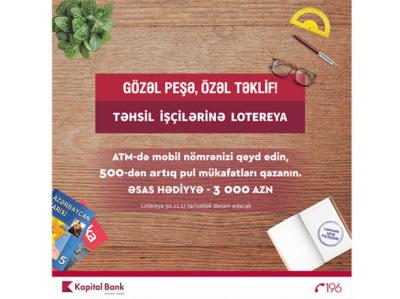 Bundan başqa, "Kapital Bank"ın “Gözəl peşə, özəl təklif” adlı güzəştli kredit kampaniyası da 30 noyabr 2017-ci il tarixədək davam edir. Aksiya çərçivəsində "Kapital Bank" kartları ilə məvacib alan təhsil işçilərinə illik faiz dərəcəsində 2%-dək endirim edilir, 8 000 AZN-dək məbləğdə kreditlər isə zaminsiz verilir. Kreditin məbləği 300 – 20 000 manat təşkil edir, müddəti isə 3 aydan 48 ayadək rəsmiləşdirilə bilər. Kredit rəsmiləşdirilməsi üçün əmək haqqı kartı və şəxsiyyəti təsdiq edən sənəd tələb olunur.