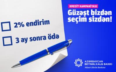 “Azərbaycan Beynəlxalq Bankı” (ABB) ASC payız fəslinə özəl yeni kredit kampaniyası elan edib. Bu kampaniyanın əsas üstünlüyü ondan faydalanmaq istəyən müştərilərə geniş seçim imkanı yaratmasındadır. Belə ki, kampaniya çərçivəsində nağd pul kreditini bankdan indi alıb, əsas borcun aylıq ödənişlərinə üç ay sonra başlamaq mümkündür. Yaxud bunun əvəzinə kredit faizlərində 2% endirimi seçmək olar.